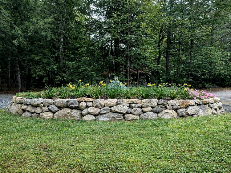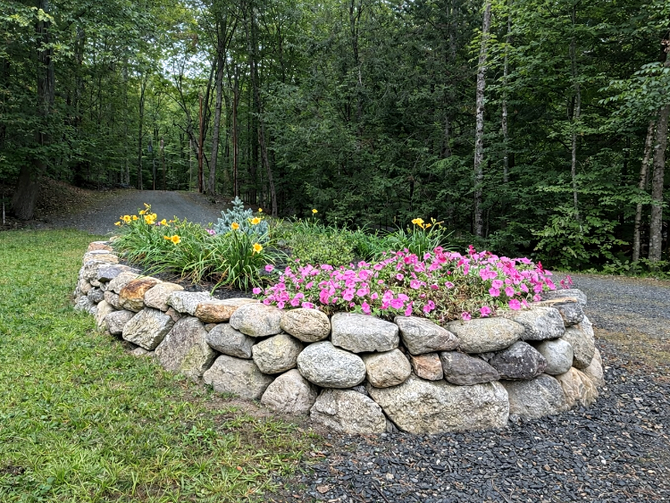 A rustic fieldstone planter greets visitors with seasonal flowers and shrubs at this lakeside cabin.
